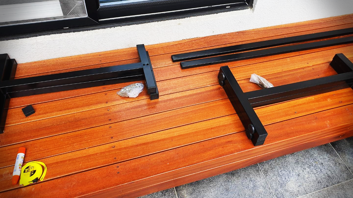 이 다리위에 나무 상판을 올려두고 나사를 조이면 끝! 이렇게 서재방에 ㄱ자로 가득 차도록 책상을 배치했다. 서재방에 맞게 맞춤 책상을 제작하려면 이보다 훨씬 많이 들어가는데 저렴하게 해결했다. 지인이 맞춤 책상을 저렴하게 했는데 80만원이었다.